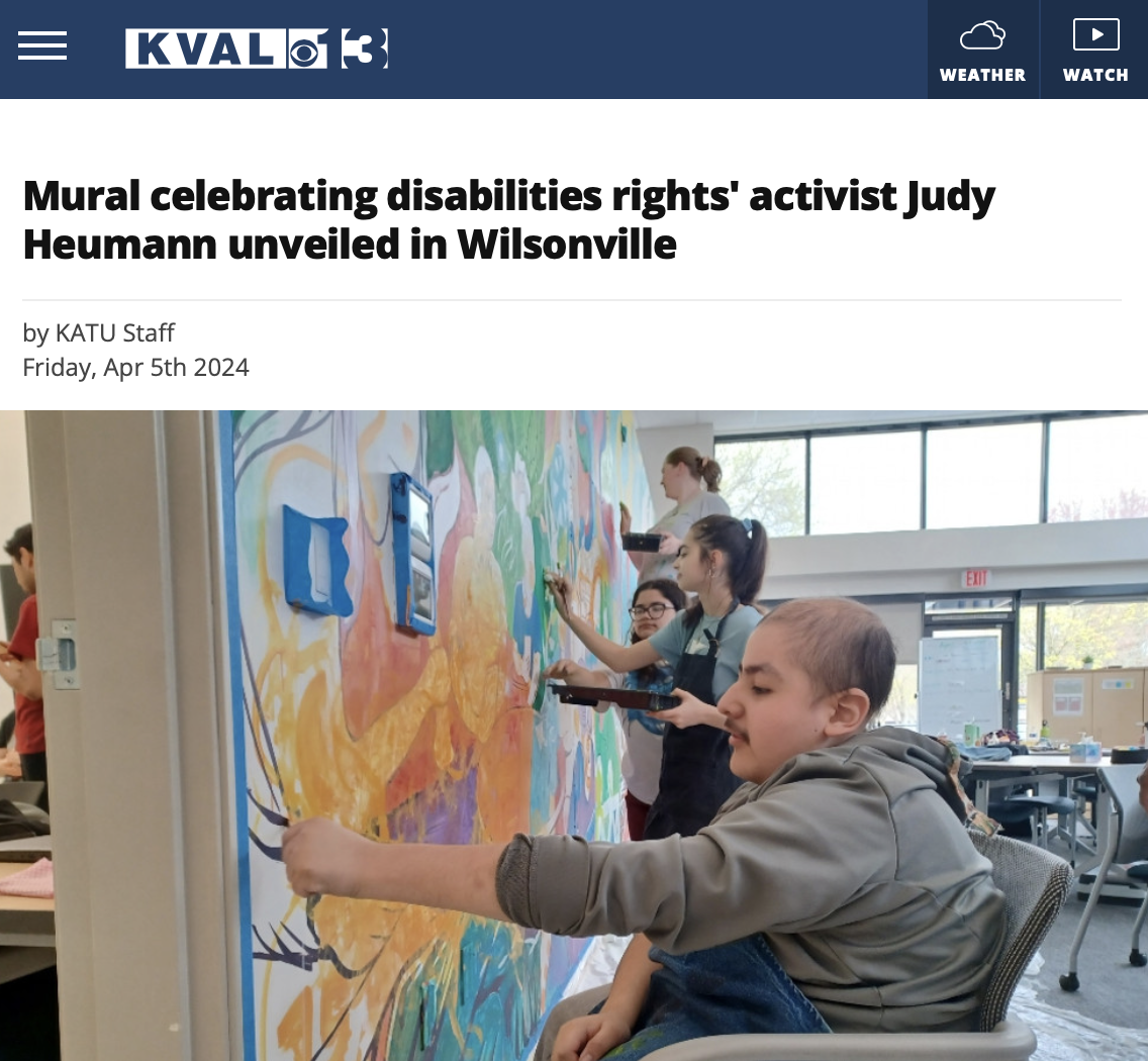 The “Judy Heumann Adult Transition Center Mural Project” celebrates the life and legacy of Judith "Judy" Heumann (1947-2023), an iconic figure in the Disability Rights Movement. This project aims to honor Heumann's contributions to inclusivity and advocacy. This project centers around the creation of a mural in downtown Wilsonville, serving as a focal point for the adult transition center catering to individuals aged 18 to 21. The mural will not only honor Judy Heumann but also embody the theme of inclusion, incorporating personal messages from students, faculty, and community members. The mural, led by artist Kyle Holbrook(Artist), will serve as a visual representation of inclusion and “rightful presence”, Will be in the aesthetic combination of a mirror painted on the wall in conjunction with canvases, creating a unique visual experience. The unveiling ceremony was April 5, 2024 at 2:30 PM at the Judy Heumann Adult Transition Center, located at 8553 SW Main St, Wilsonville, OR 97070.